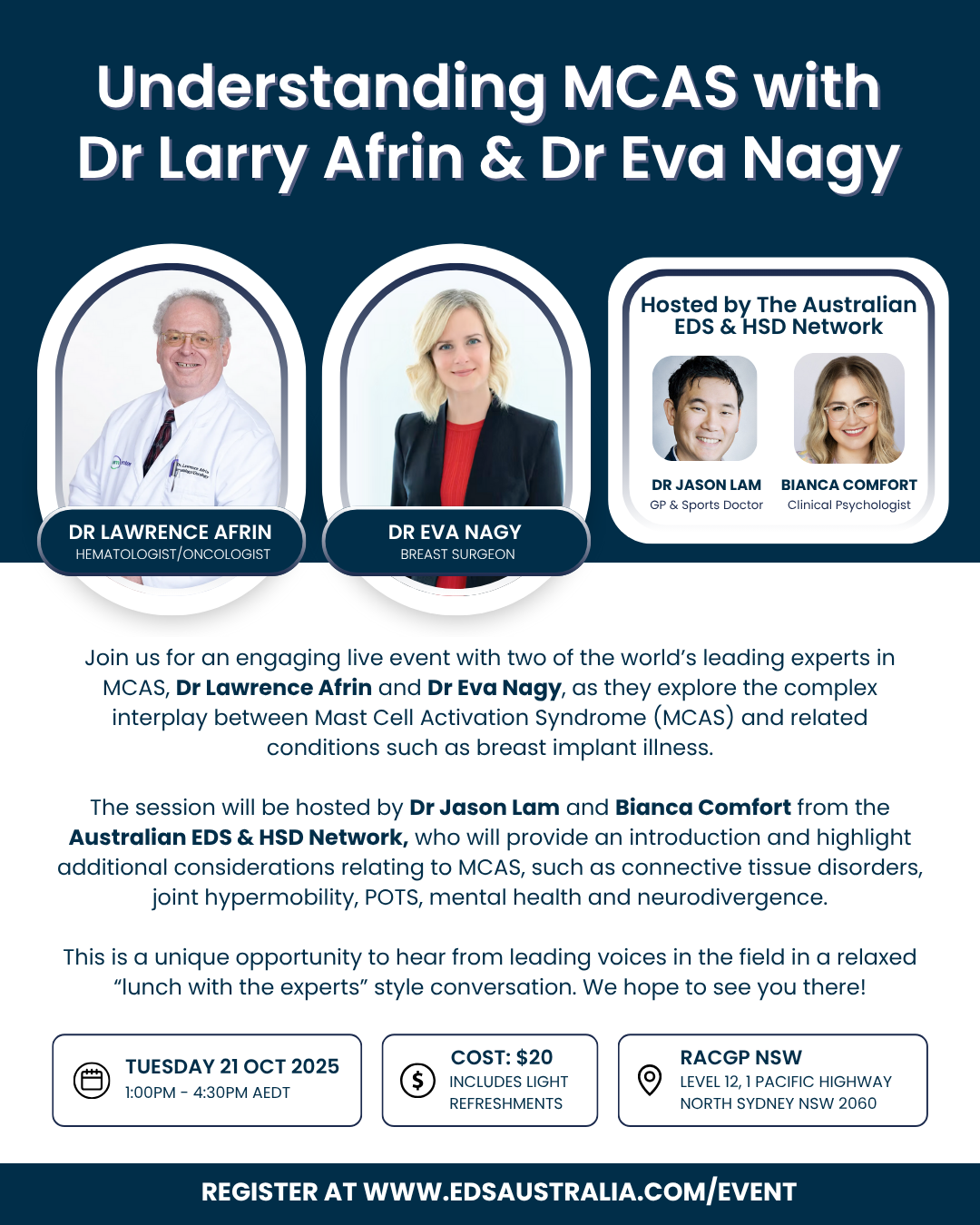 Join us for an afternoon conversation on MCAS and comorbidities with world leaders Dr Larry Afrin and Dr Eva Nagy. Hosted by network members Dr Jason Lam and Bianca Comfort.